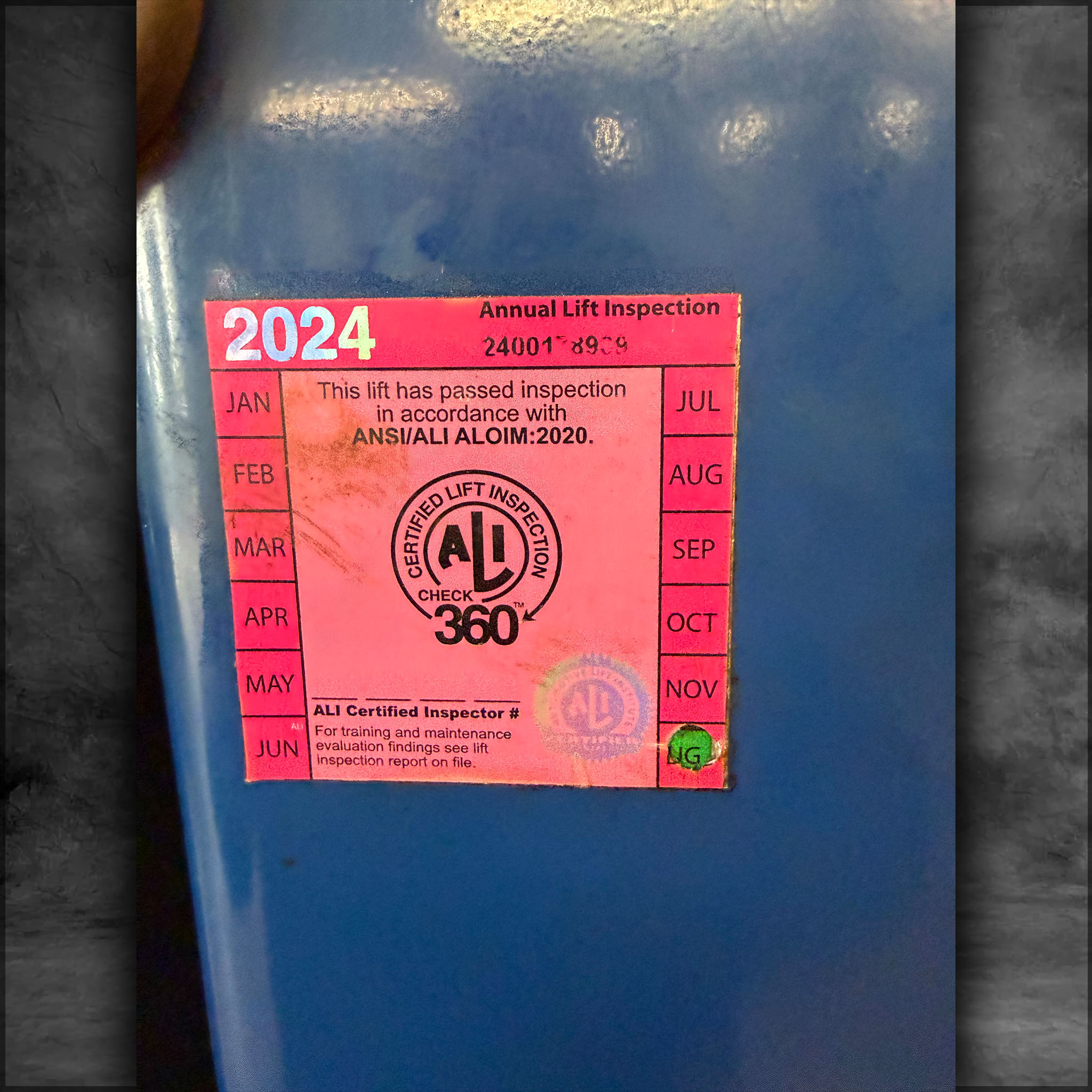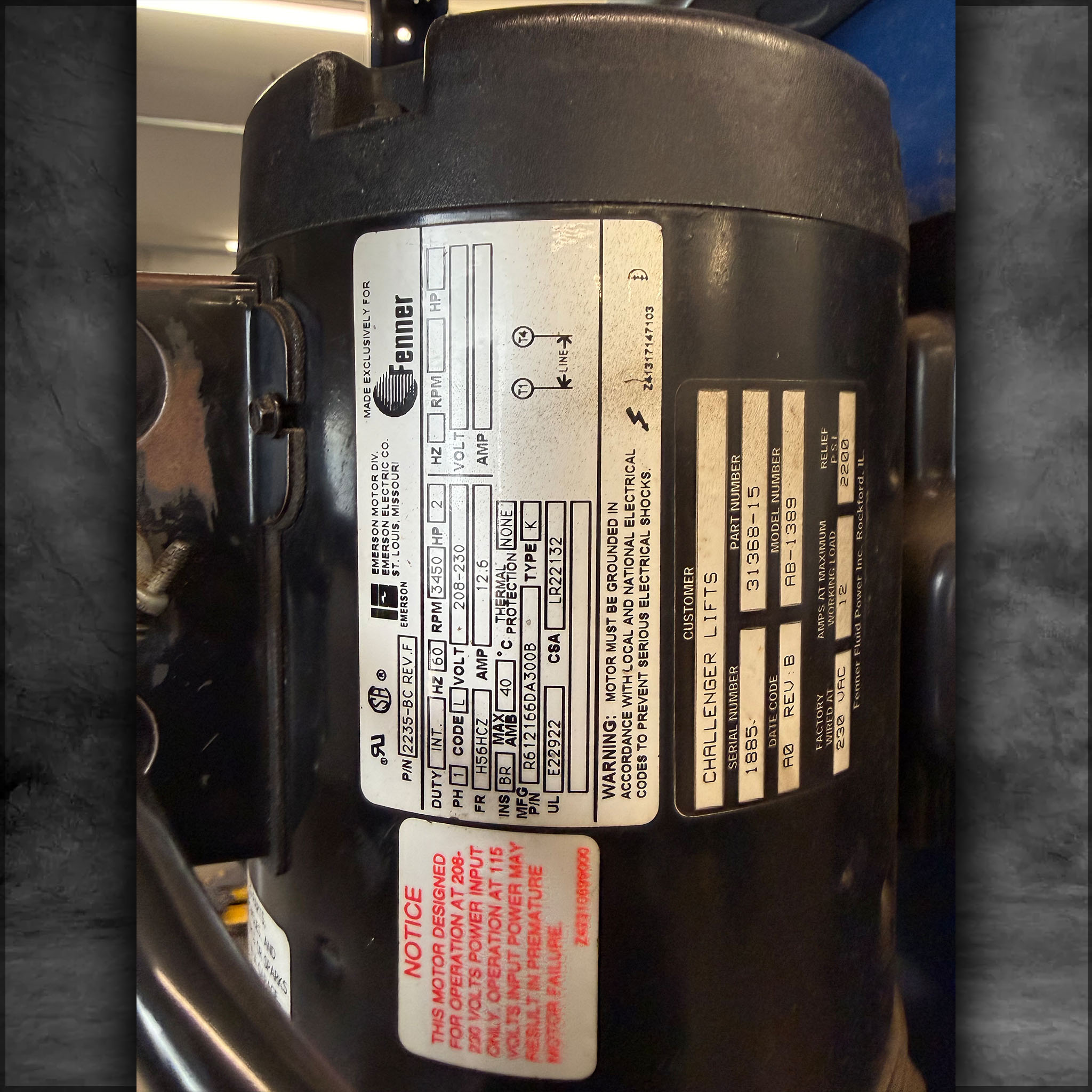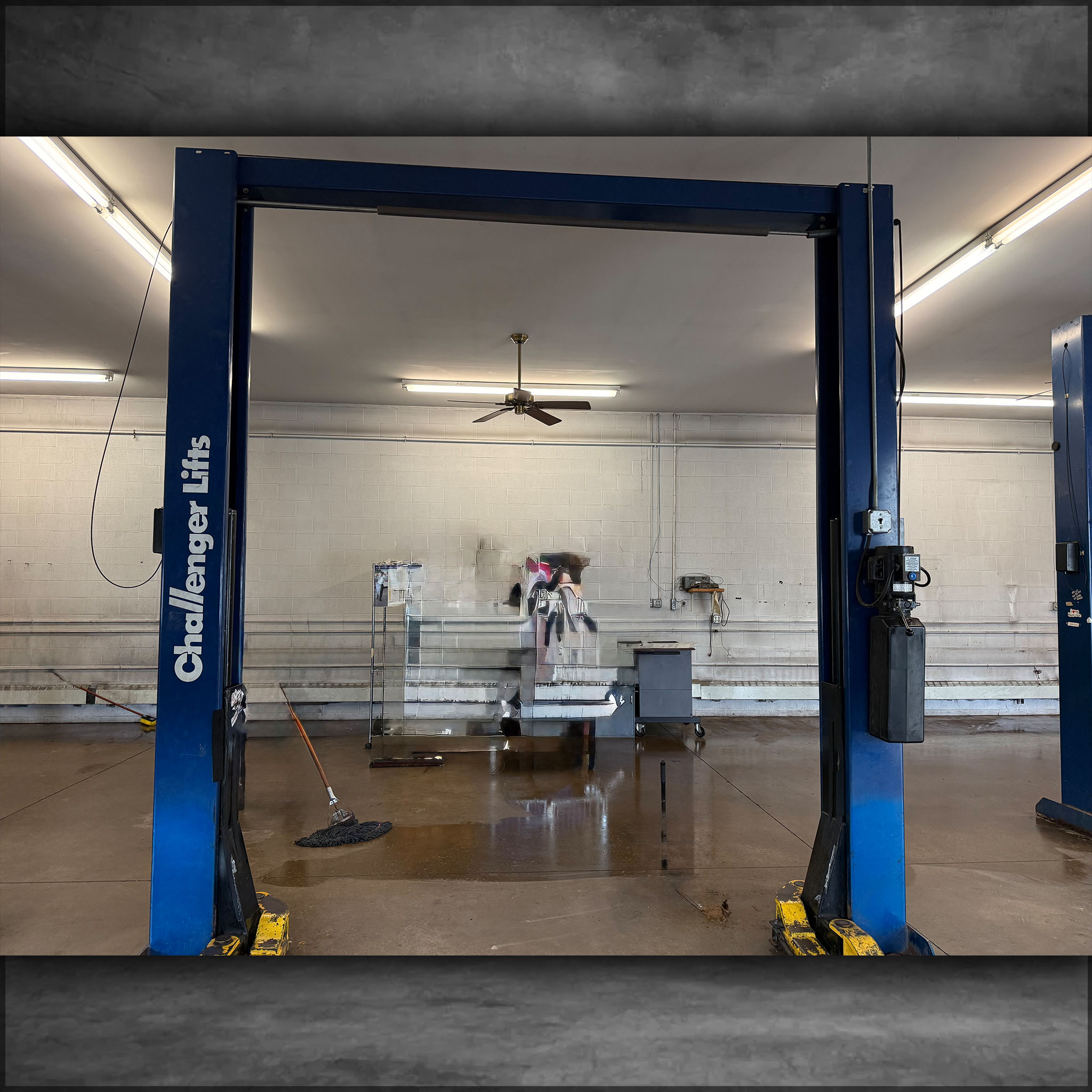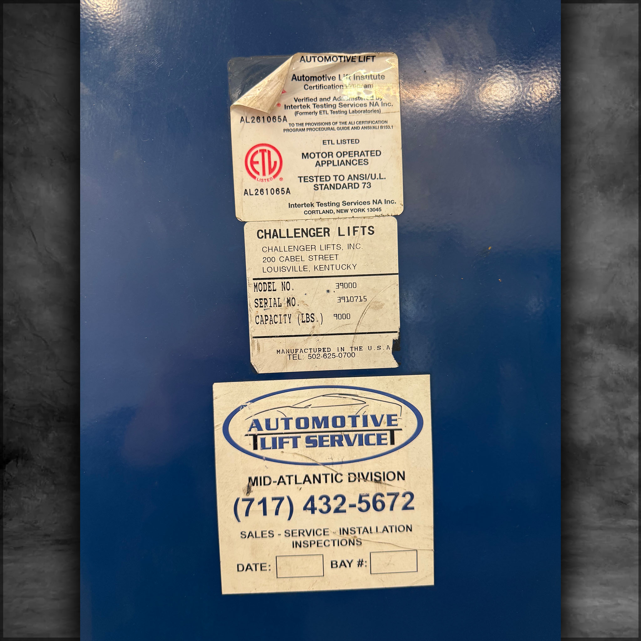 Challenger Lift Model 39000, 9000 lb capacity, tested and inspected Dec 2024, single-phase 208V.
