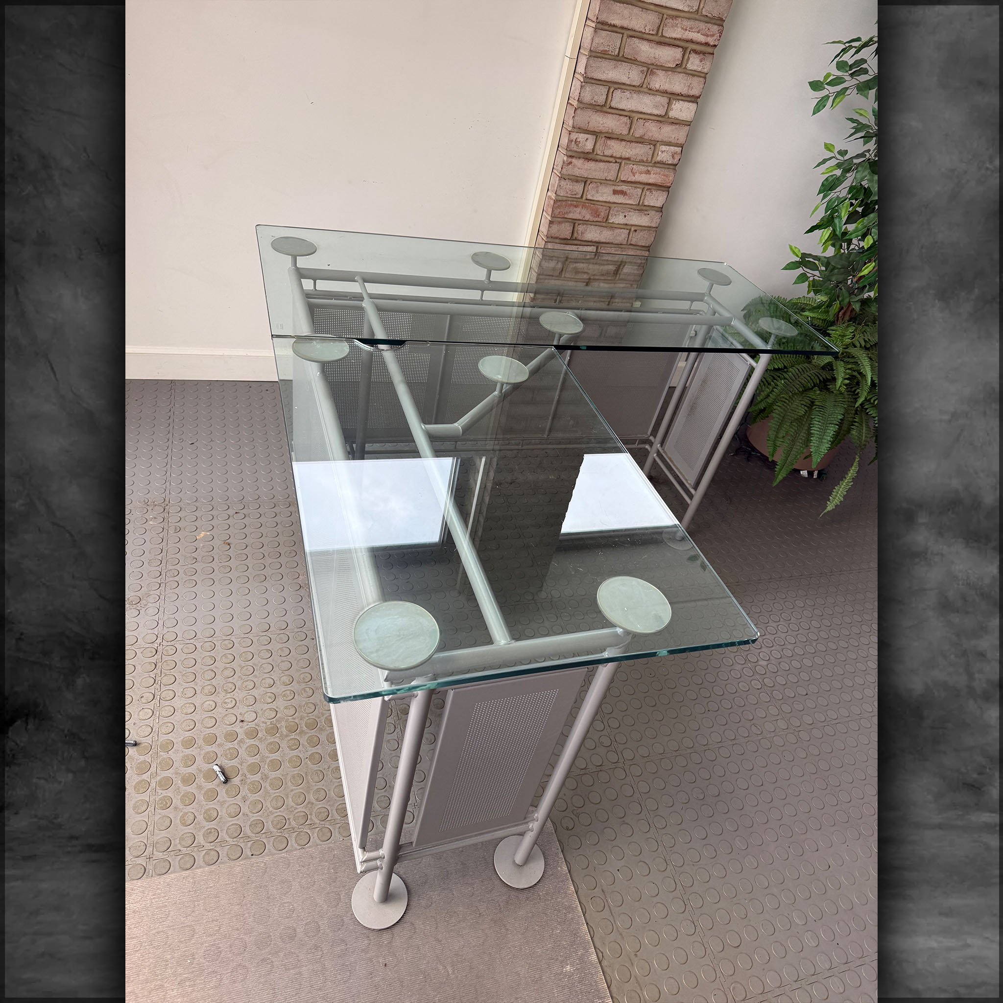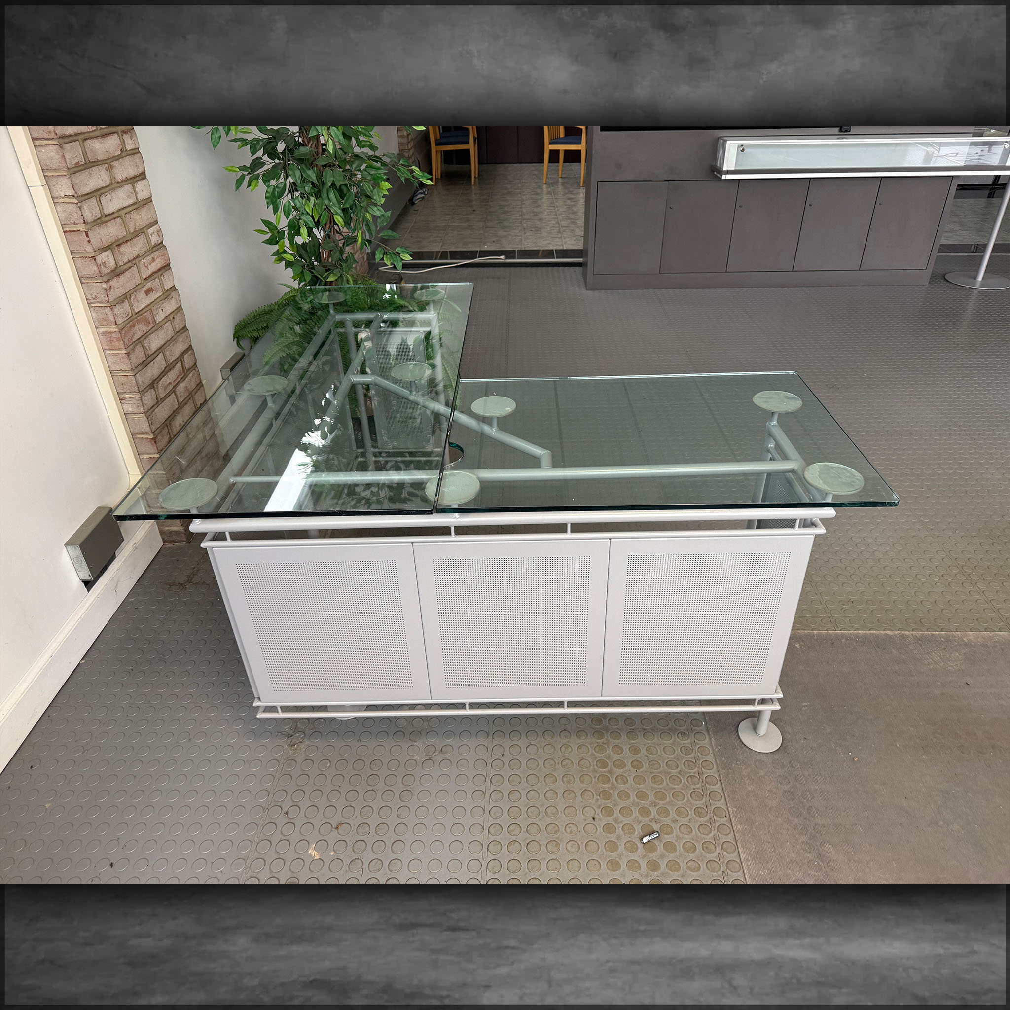 Glass desk, very nice, return can be either right or left, 53 inches long, 53 inches wide.