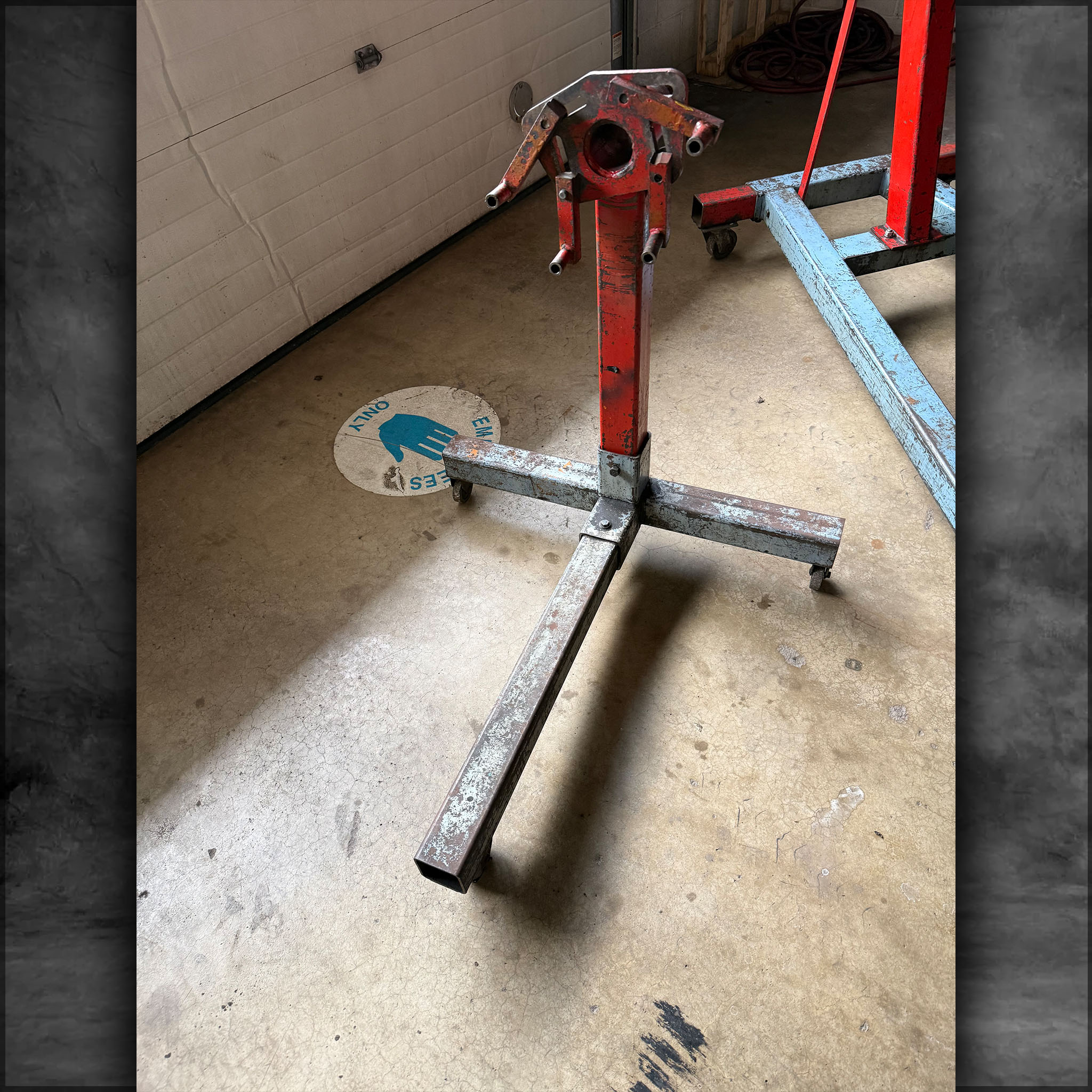 Engine stand, blue and red.