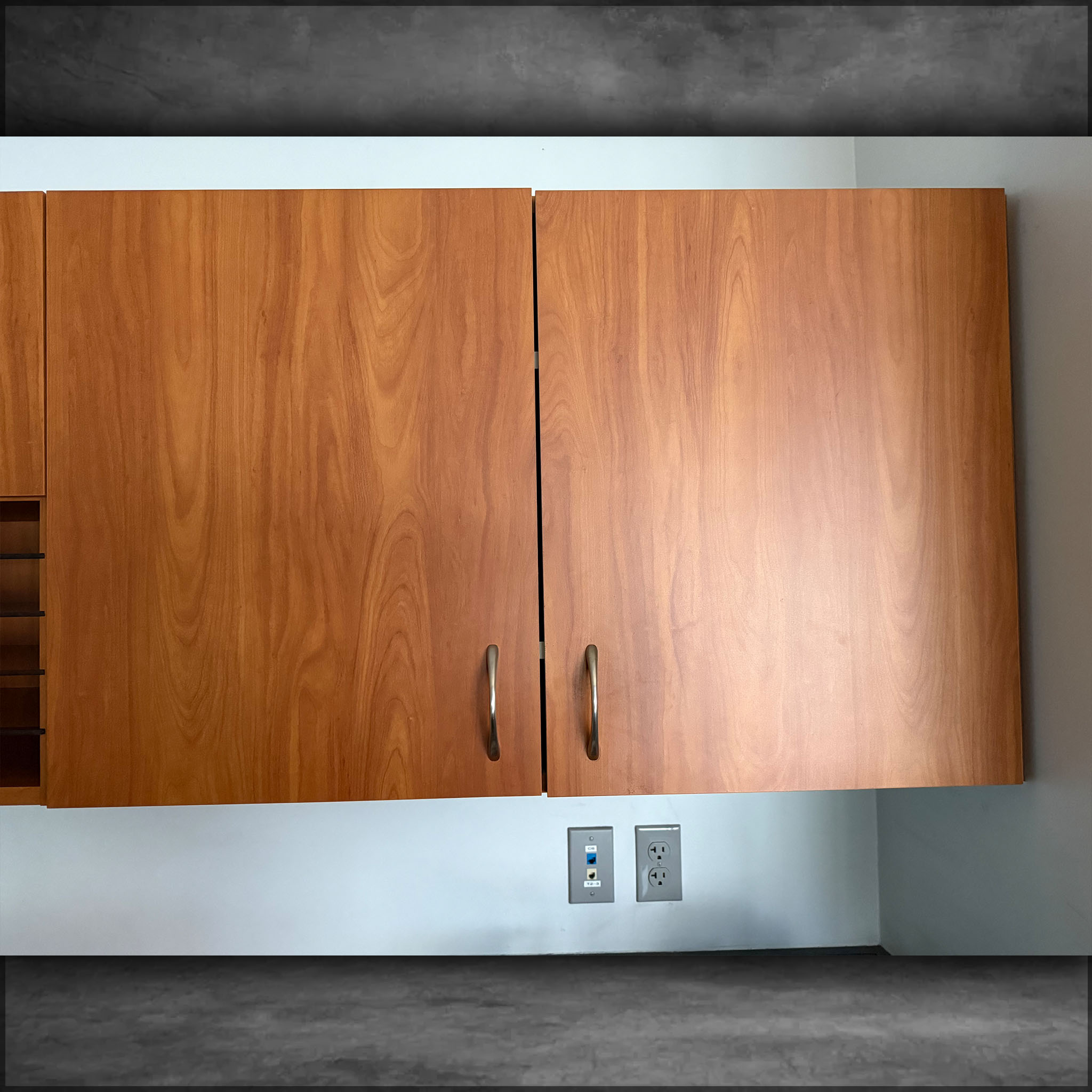 Wood cabinet with doors, 41.5 inches wide, 25.5 inches tall.